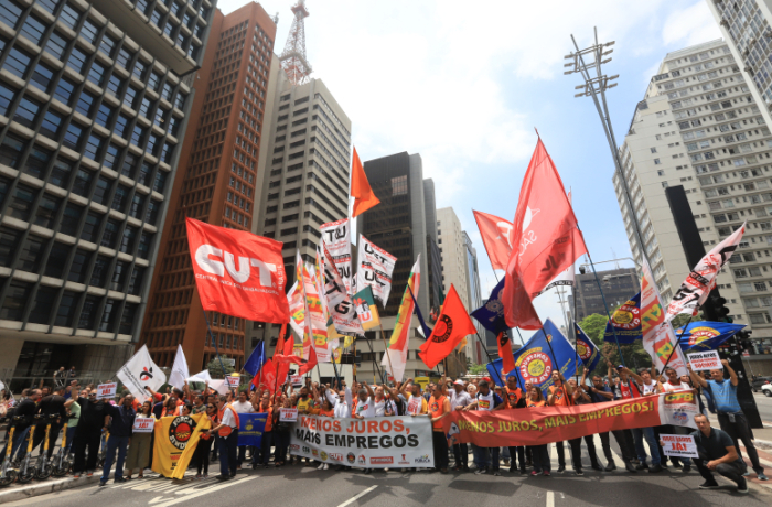 A CUT, as demais centrais sindicais e representantes do movimento estudantil realizaram, na manhã desta terça-feira (4), um protesto em frente à sede do Banco Central (BC) de São Paulo, na Avenida Paulista.